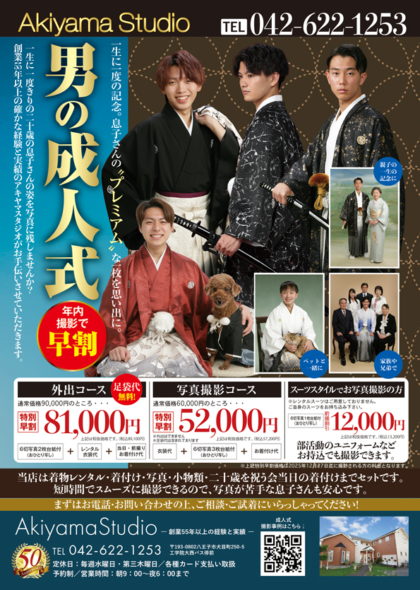 アキヤマスタジオでは成人式用男性着物の種類を多く取り揃えております。