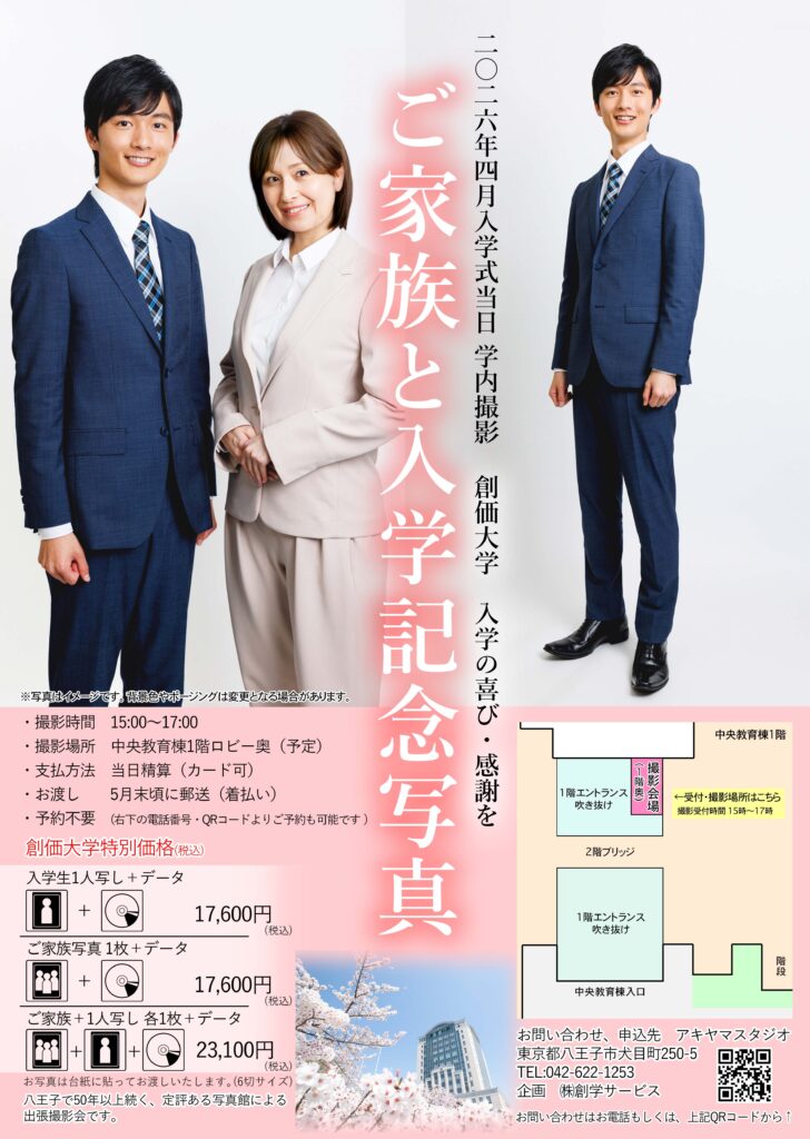 今年度も4/2入学式当日に創価大学学内で出張記念写真撮影を行います。
